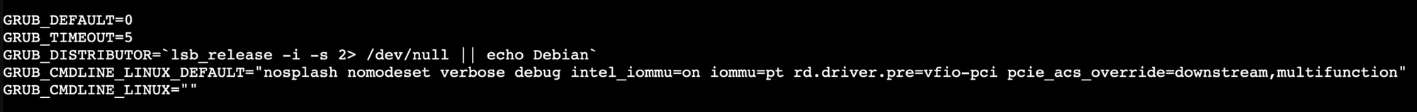 GRUB_CMDLINE_LINUX_DEFAULT="intel_iommu=on iommu=pt rd.driver.pre=vfio-pci pcie_acs_override=downstream,multifunction"