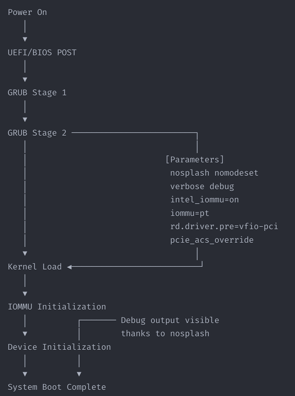 GRUB parameters can influence each of these steps, particularly for complex components like GPUs and their associated subsystems.